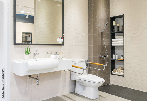 Disabled Bathroom Interior : Disabled Toilet Accessories Making Life Easier In The Bathroom : Bradley corporation usa, a manufacturer of plumbing fixtures and bathroom accessories, has developed standard models of bathrooms for people with disabilities, delivering the basic requirements.. But if space is tight, remodelers may be able to make do with less. Using a bathroom is difficult enough for a disabled person, so smart bathroom design should make it easier for a handicapped user to take care of their own hygiene. To meet the ada accessibility standard, doors must have a clear width of 32 inches from the face of the door to the opposite stop. A child, a person with a. Photo about interior of bathroom for the disabled or elderly people.